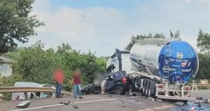 De acordo com a PRF, o acidente envolveu um caminhão, uma van e um Ford EcoSport. Após o impacto inicial entre os veículos maiores, o EcoSport também acabou sendo atingido. O caminhão estava sem carga no momento do acidente, já que o tanque se encontrava vazio.