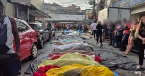 Moradores do Complexo da Penha, na Zona Norte do Rio de Janeiro, levaram pelo menos 74 corpos para a Praça São Lucas, na Estrada José Rucas, uma das principais da região, ao longo da madrugada desta quarta-feira (29), o dia seguinte à operação mais letal da história do RJ.