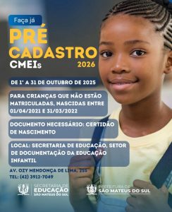 A Secretaria de Educação de São Mateus do Sul anunciou a abertura do pré-cadastro para vagas nos Centros Municipais de Educação Infantil (CMEIs) referentes ao ano de 2026. O período de inscrições será de 1º a 31 de outubro de 2025.