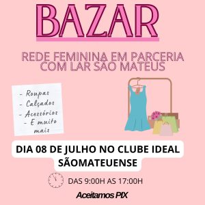 A Rede Feminina de Combate ao Câncer, em parceria com o Lar São Mateus, promove nesta terça-feira, 8 de julho, um bazar beneficente no Clube Ideal Sãomateuense. O evento acontece das 9h às 17h, com entrada gratuita e variedade de produtos à disposição do público.