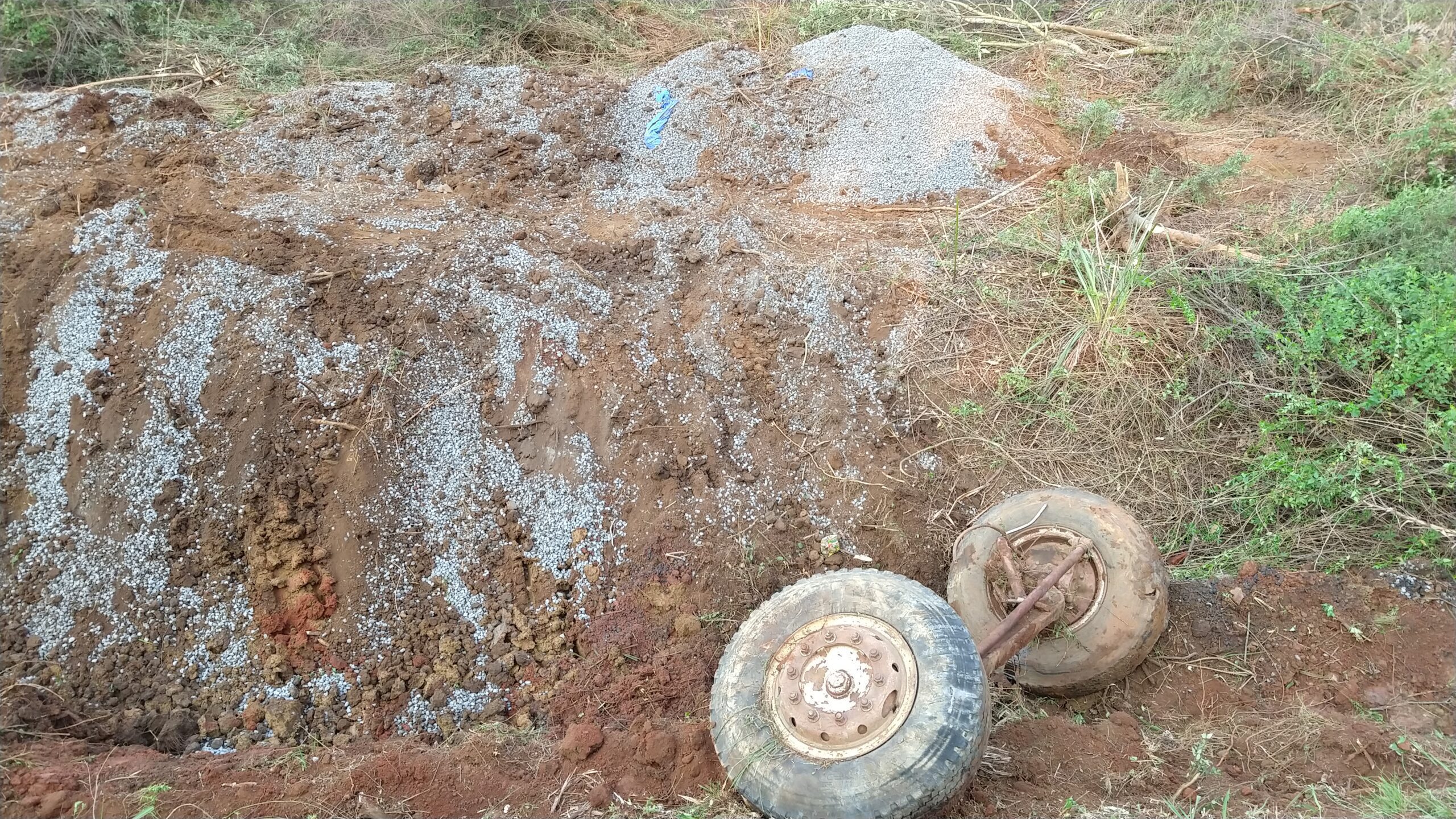 Um caminhão caçamba carregado com pedra brita tombou na PR-151, Km 465, localidade de Água Suja, na tarde desta terça-feira (15).