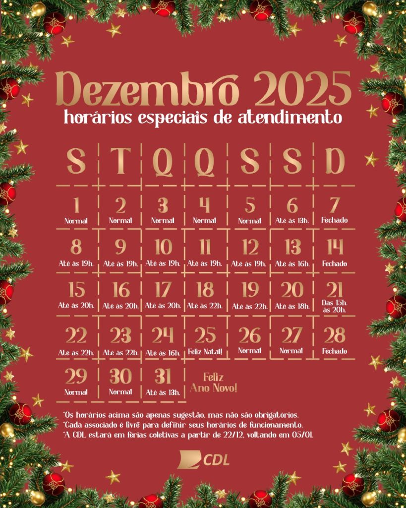 Entre os destaques do calendário estão os dias com atendimento estendido até as 19h, 20h e até 22h, além dos horários diferenciados aos finais de semana, véspera de Natal e fim de ano. No dia 25 de dezembro, o comércio permanece fechado, retomando as atividades no dia 26. Já no dia 31, o atendimento vai até as 13h.
