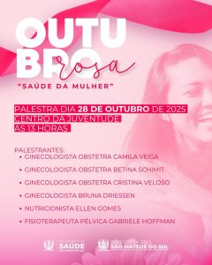 A campanha Outubro Rosa segue com programação especial em São Mateus do Sul. No dia 28 de outubro de 2025, o Centro da Juventude será palco de uma palestra voltada à saúde da mulher, com início às 13h.
