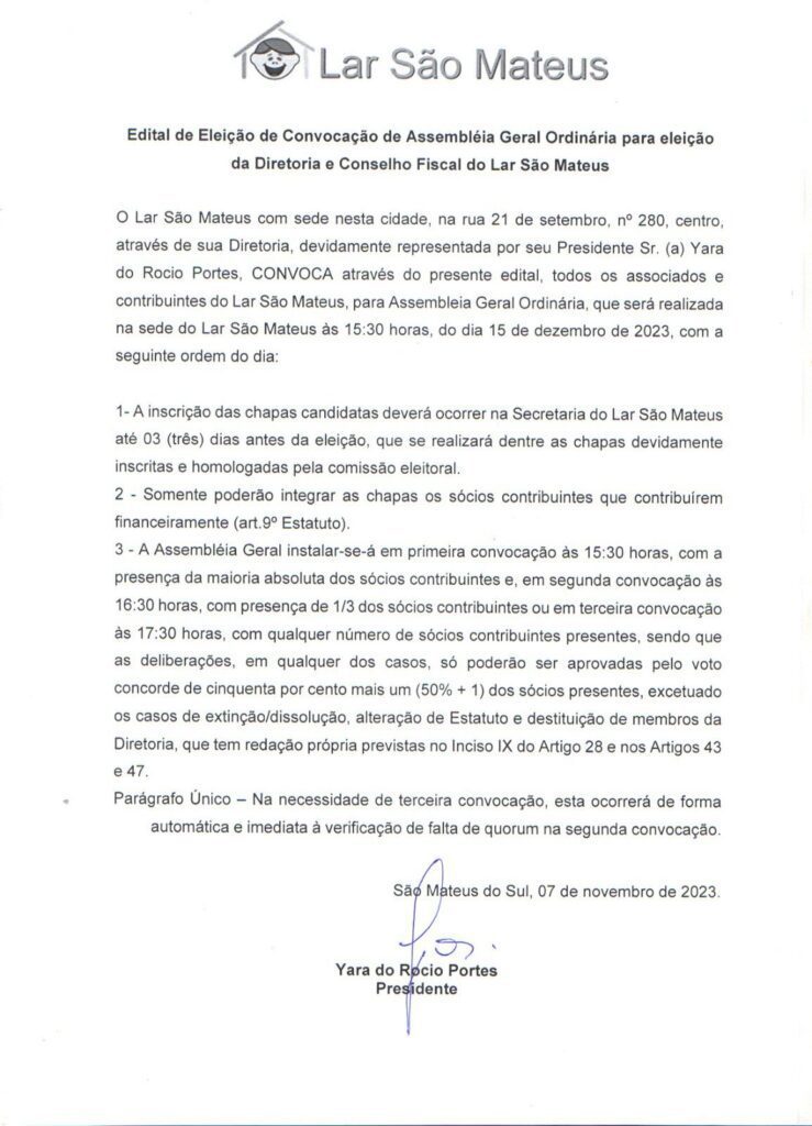 Data e Horário: A eleição ocorrerá no dia 15 de dezembro de 2023, com início às 15h30min, na sede da entidade Lar São Mateus.