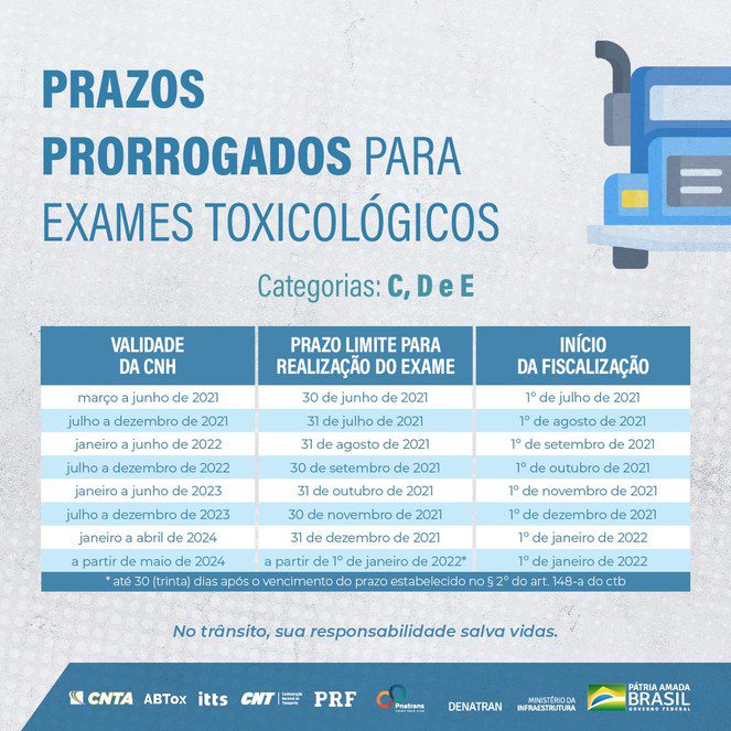O Conselho Nacional de Trânsito (Contran), prorrogou os prazos para a realização do exame toxicológico periódico para o condutor habilitado nas categorias C, D e E. Publicadas na edição de quarta-feira (28/04), do Diário Oficial da União (DOU), as novas datas foram decididas por conta da pandemia de Covid-19, com amplo debate dentro do Fórum Permanente para o Transporte Rodoviário de Cargas (Fórum TRC), com a Associação Brasileira de Toxicologia (ABTOX), Confederação Nacional do Transporte (CNT), Confederação Nacional dos Transportadores Autônomos (CNTA) e a Polícia Rodoviária Federal (PRF).