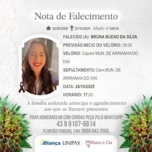 A jovem Bruna Bueno da Silva, de 17 anos, faleceu nesta segunda-feira (27) após mais de dois meses de internação no Hospital da Providência, em Apucarana, devido a complicações de um quadro de meningite. Segundo familiares, ela passou por várias cirurgias durante o tratamento, mas seu estado de saúde se agravou, resultando em seu falecimento.