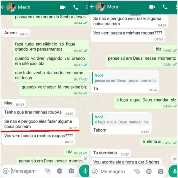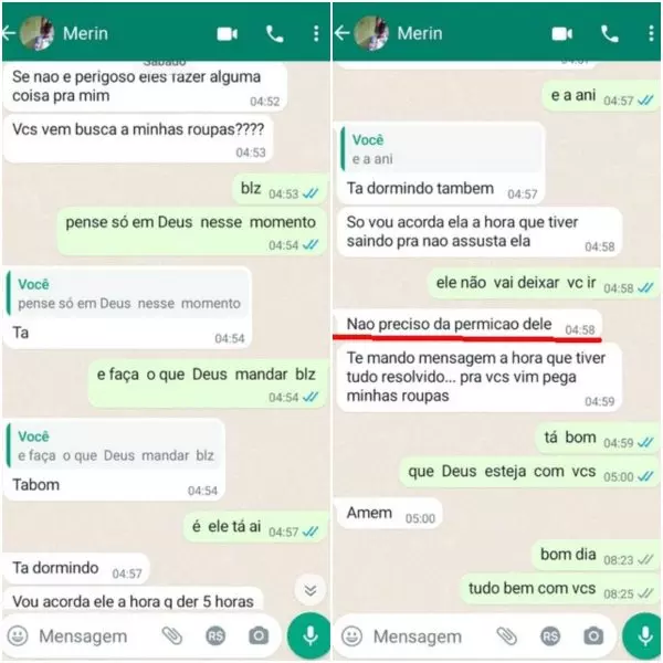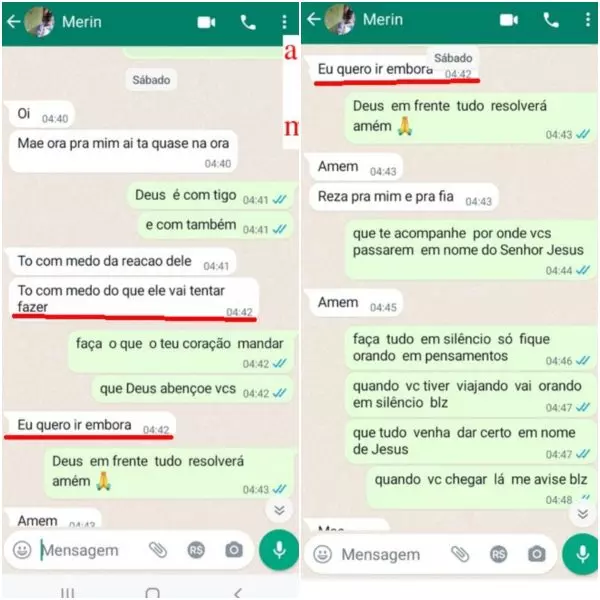 De acordo com os prints, a jovem havia decidido acordar o marido por volta das 5h e pedir o divórcio. Pouco antes, já na madrugada, ela confessou à mãe que estava com medo do que o companheiro faria. “Mãe, ora pra mim aí, que está quase na hora”, escreveu a jovem. “Tô com medo da reação dele. Tô com medo do que ele vai tentar fazer”, disse. “Eu quero ir embora”, comentou ainda Merin.