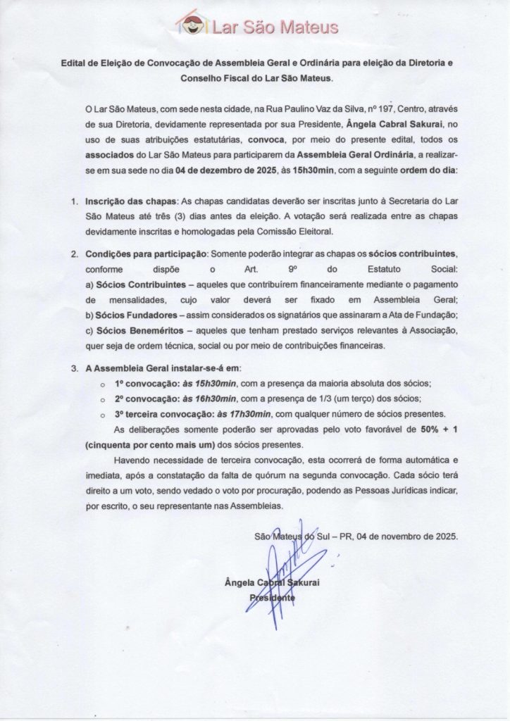 O Lar São Mateus divulgou o edital de convocação para a Assembleia Geral Ordinária, que será realizada no dia 4 de dezembro de 2025, a partir das 15h30, na sede da instituição, localizada na Rua Paulino Vaz da Silva, nº 197, no Centro de São Mateus do Sul.
