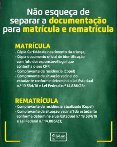 - Comprovante da situação vacinal do estudante, conforme a Lei Estadual nº 19.534/18 e Lei Federal nº 14.886/23.
