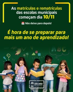 A Prefeitura de São João do Triunfo, por meio da Secretaria Municipal de Educação, divulgou o cronograma de matrículas e rematrículas para o ano letivo de 2026 na rede municipal de ensino. O processo começa no dia 10 de novembro e se estende até o dia 24, conforme o calendário definido para cada instituição de ensino.