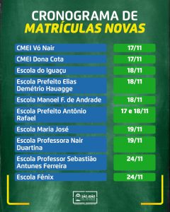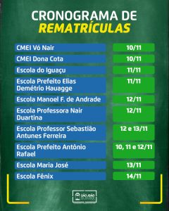 O período de rematrículas inicia em 10 de novembro e contempla todas as escolas e Centros Municipais de Educação Infantil (CMEIs). Já as matrículas novas terão início no dia 17 de novembro. A orientação da Secretaria é que os pais ou responsáveis não deixem para a última hora e já providenciem toda a documentação necessária.