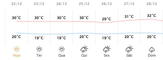 Nesta segunda-feira (22), o dia começou com tempo firme e sol predominando, com temperatura máxima em torno de 30 °C e mínima de 20 °C. Na terça (23) e quarta-feira (24), o cenário se mantém semelhante, com sol ao longo do dia e temperaturas elevadas, alcançando novamente os 30 °C, enquanto as mínimas ficam próximas dos 19 °C.