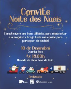 A magia do Natal vai tomar conta de São Mateus do Sul no dia 10 de dezembro, quando será realizada mais uma edição da Noite dos Noéis, evento organizado pela CDL, ACIASMS e Prefeitura Municipal. A programação começa às 18h, com a tradicional descida do Papai Noel da Cuia, momento muito aguardado pelas famílias e crianças.