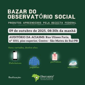 O Observatório Social de São Mateus do Sul realiza, no próximo dia 09 de outubro, um bazar especial com produtos apreendidos pela Receita Federal. O evento acontecerá a partir das 08h30, no auditório da ACIASMS (Rua Ulisses Faria, nº 1011, Centro).