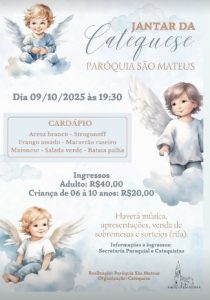 A Paróquia São Mateus promove nesta quinta-feira (9) o tradicional Jantar da Catequese, um evento especial de confraternização e integração entre catequizandos, famílias e comunidade. A atividade, organizada pela equipe da Catequese Paroquial, terá início às 19h30, no salão paroquial.