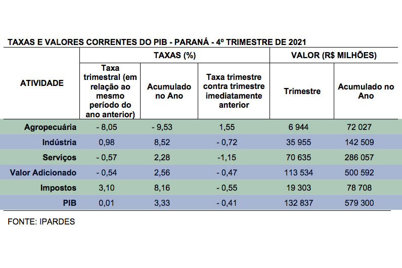 No quarto trimestre de 2021, o Produto Interno Bruto do Paraná totalizou R$ 132,84 bilhões, sendo R$ 113,53 bilhões referentes ao valor adicionado a preços básicos e R$ 19,3 bilhões aos impostos.