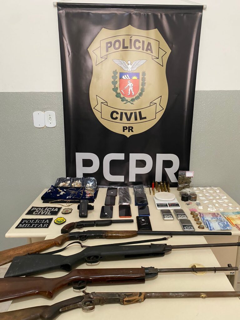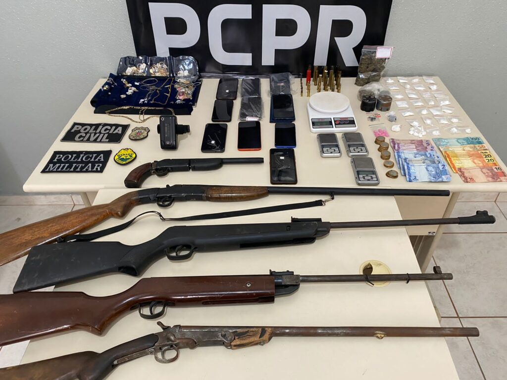 A mesma ação, ainda, apreendeu uma significativa quantidade de drogas: 212 gramas de maconha, 87 gramas de cocaína, 11 comprimidos de ecstasy e 11 selos de LSD; além de instrumentos utilizados para o uso e comercialização de entorpecentes, dinheiro em espécie, 3 espingardas, 1 pistolete, 33 munições, diversos objetos de procedência ilícita e aparelhos celulares.