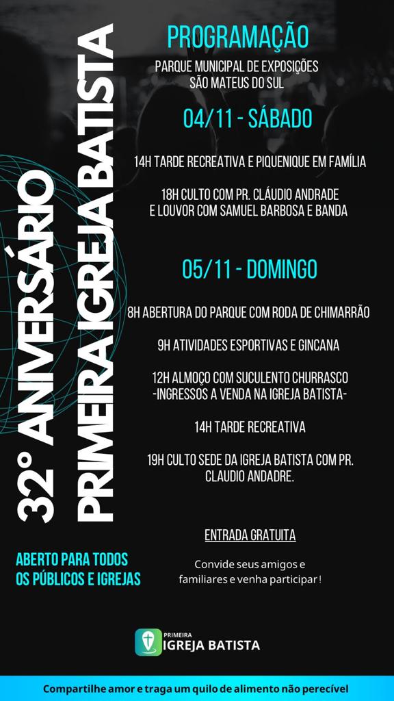“A Primeira Igreja Batista de São Mateus do Sul convida calorosamente toda a comunidade local e todos os que desejam participar a se juntar a essa celebração de fé e união. Venha fazer parte deste evento especial e celebrar 32 anos de história da Primeira Igreja Batista de São Mateus do Sul. Será uma oportunidade única de fortalecer a fé, compartilhar amor, esperança e estreitar laços em nossa comunidade”, destacaram os organizadores .