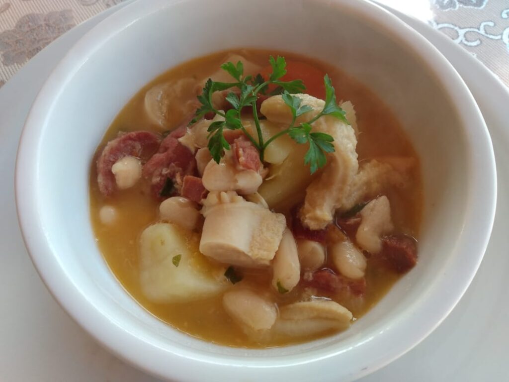 Corte em cubos grandes a cenoura e acrescente na panela junto com a mandioca e o feijão branco. Coloque água fervente até engrossar o caldo.