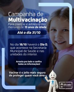 A Secretaria Municipal de Saúde de São João do Triunfo realiza neste sábado, 18 de outubro, o Dia D da Campanha de Multivacinação, voltada para crianças e adolescentes de até 15 anos de idade. A ação tem como objetivo atualizar as cadernetas de vacinação, garantindo a proteção contra diversas doenças, como sarampo, febre amarela e HPV.
