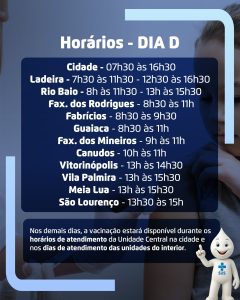 Durante o Dia D, as vacinas estarão disponíveis na cidade e em várias comunidades do interior, com horários definidos para cada localidade.