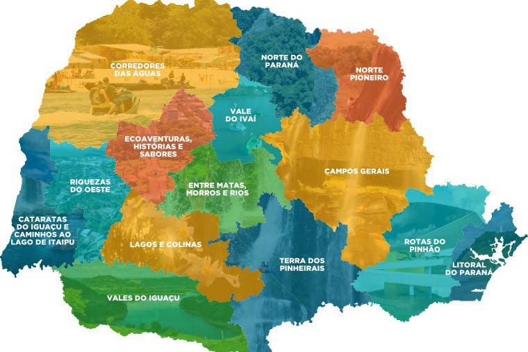 As 15 Regiões Turísticas oferecem ao visitante uma estimulante jornada, seja qual for seu perfil. São elas: Campos Gerais – Cataratas do Iguaçu e Caminhos ao Lago de Itaipu – Corredores das Águas – Ecoaventuras Histórias e Sabores – Entre Matas, Morros e Rios – Lagos e Colinas – Litoral do Paraná – Norte do Paraná – Norte Pioneiro – Riquezas do Oeste – Rotas do Pinhão –  Sul do Paraná – Terra dos Pinheirais – Vale do Ivaí – e Vales do Iguaçu.