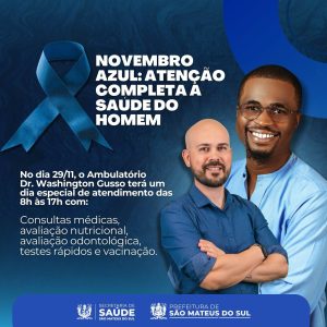 A Secretaria Municipal de Saúde de São Mateus do Sul realizará nesta sexta-feira, 29 de novembro, uma ação especial dedicada ao público masculino, dentro da campanha Novembro Azul. O atendimento acontecerá no Ambulatório Dr. Washington Gusso, das 8h às 17h, com uma série de serviços voltados à prevenção e ao cuidado integral da saúde do homem.
