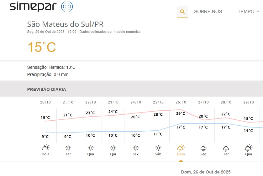 A previsão do tempo para São Mateus do Sul, indica uma semana predominantemente ensolarada. A segunda-feira (20) começa com céu nublado, mas o sol deve aparecer ao longo do dia, com mínima de 10°C e máxima de 21°C. Terça-feira (21) segue parcialmente nublada, mantendo temperaturas entre 11°C e 21°C, enquanto quarta-feira (22) promete sol com poucas nuvens e mínima de 10°C e máxima de 23°C.