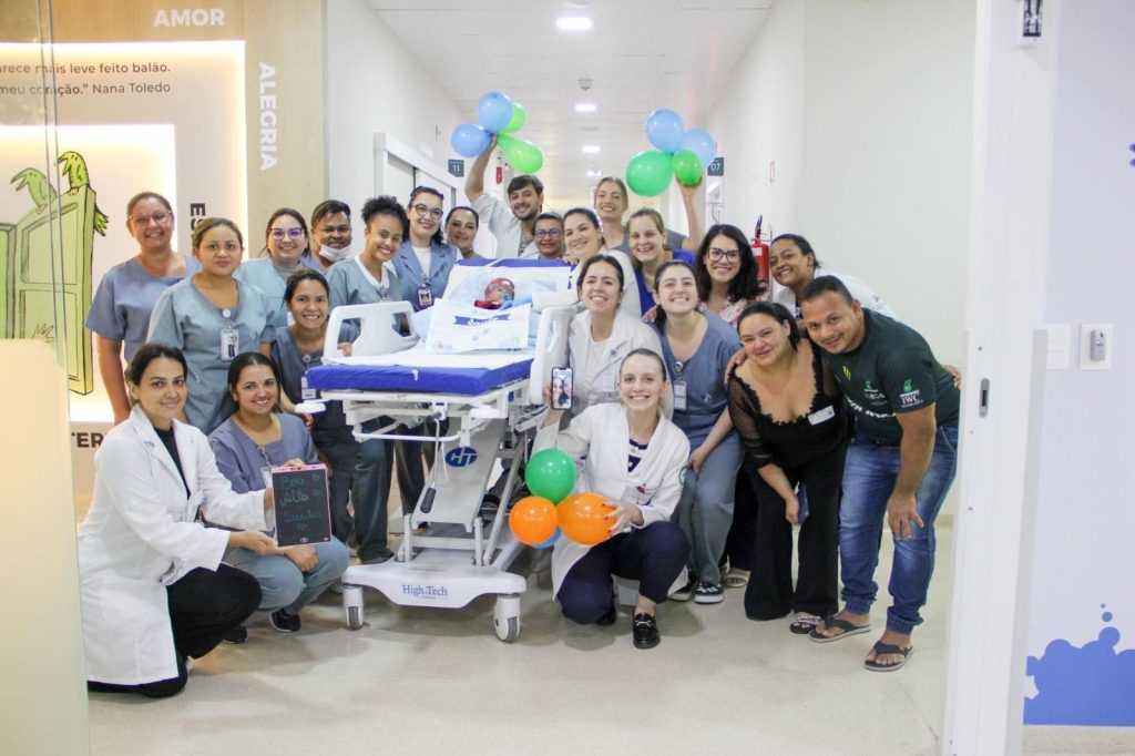 Tudo sob os olhares atentos dos pais Andriely Monteiro da Costa e Felipe Junior de Lima Lourenço. O casal não conteve a emoção ao poder levar o filho para casa e começar uma nova fase.
